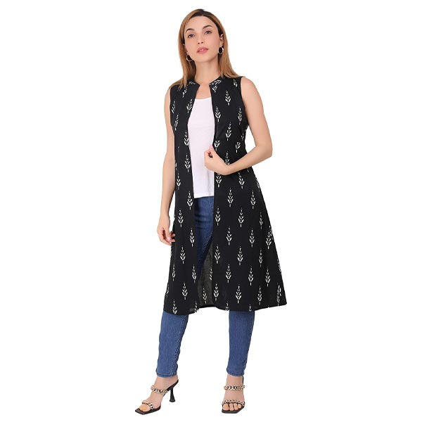 This beautifully stitched shrug will make you star of the moment. It features floral printed on black color and made of soft cotton blend fabric. Pair it with a denim jeans, jegging or trouser for party and casual day out. Can also be work as an outer on ethnic kurta. A must have outfit in your collection. We have a good collection of tops, shrugs, kurtas. Search our brand name and buy.